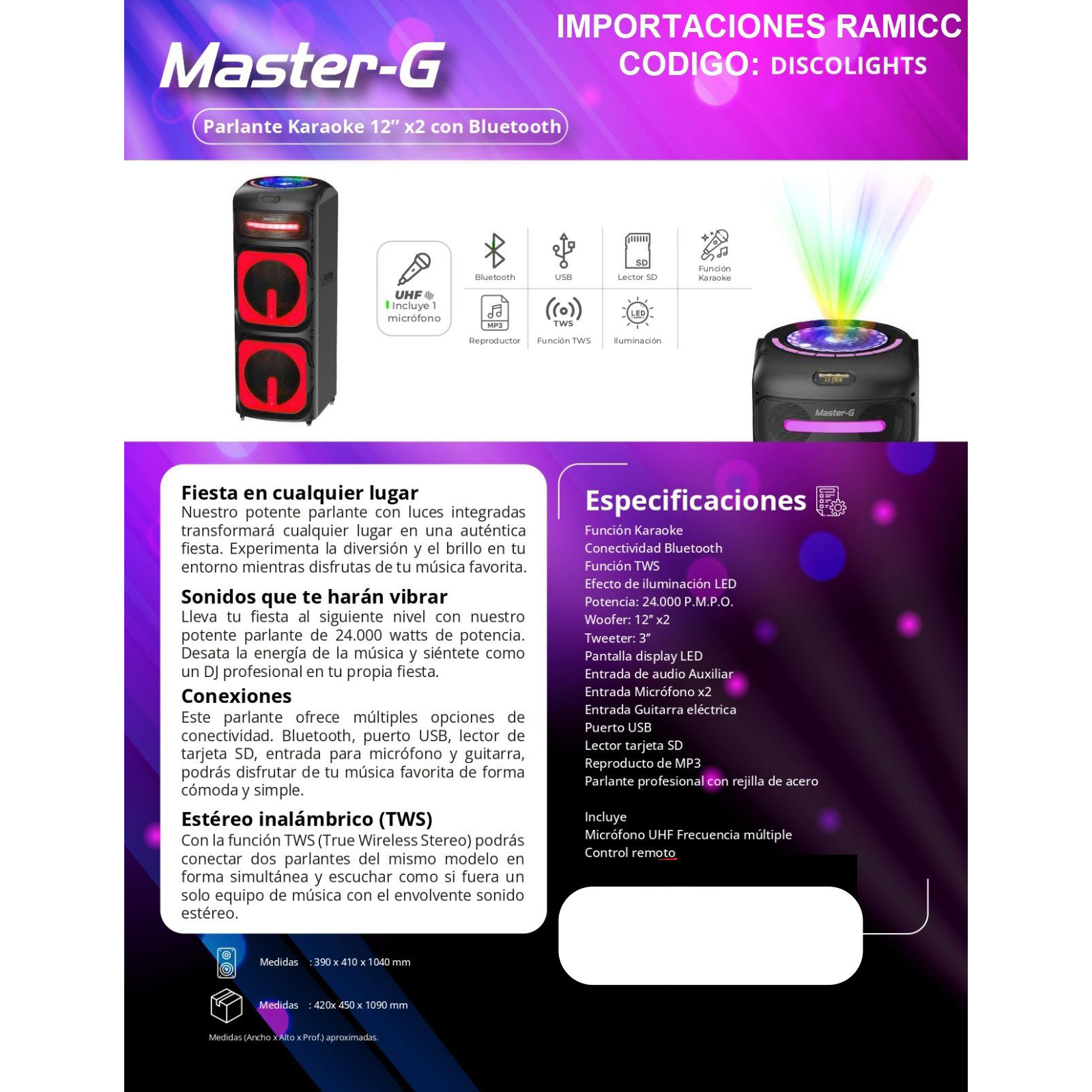 PARLANTE KARAOKE CON BLUETOOTH USB MASTER-G DISCOLIGHTS